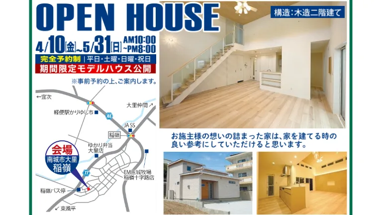 木造二階建ての住まいで、4月10日〜5月31日、10:00〜20:00の完全予約制でご案内します。
